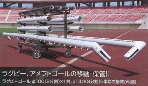 ラグビーポール BR-0001ラグビーポール(アルミ製) ●本体価格/¥1,320,000(1組) [ 消費税別途 ] ●規格・仕様/抜差式、脚折式、φ100mm、保護マット、工事費は別途 BR-0002 ラグビーポール(鉄製) ●本体価格/¥900,000(1組) [ 消費税別途 ] ●規格・仕様/W5.6×H7m×φ89.1mm、抜差、脚折式 保護マット、工事費は別途 BR-0003 ラグビーポール(鉄製) ●本体価格/¥800,000(1組) [ 消費税別途 ] ●規格・仕様/W5.6×H7m×φ89.1mm、鉄製、固定式、 保護マット、工事費は別途 BR-0010 サッカーゴール(埋込式)・ラグビーゴール用保管台車 ●本体価格/¥424,000(1台) [ 消費税別途 ] ●規格・仕様/W850×L2000×H1100mm、鉄製、焼付塗装、自在キャスターφ200mm、組立式、1台60kg BR-0203 ラグビーポール防護マット ●本体価格/¥156,000(4本1組)[ 消費税別途 ] ●規格・仕様/φ100×W1800×t40mm、外被:ポリエステルグリーン、芯材:ポリエチレンフォーム+ウレタン2層式 BR-0004 サッカー・ラグビー得点板 ●本体価格 /¥900,000(1台) [ 消費税別途 ] ●規格・仕様/W2.650×D1.3×H1.695m キャスター・マグネット文字板付 BR-0007 ラグビーゴール 起倒式H13m/8.7m兼用仕様 ●本体価格/¥5,500,000(1台) [ 消費税別途 ]●規格・仕様/本体アルミ合金製、アルマイト処理後電着塗装(一部焼付塗装)、ポストφ140/クロスバーφ100mm、重量1/2対190kg、埋設管(ステンレス製)附属、ターフトレイ天然芝用(ステンレス製)附属、起倒用ユニット(鉄製、メッキ処理後焼付塗装)附属●商品の特徴/安全性と利便性のふたつを両立したラグビーゴール。ウインチを使った起倒式。 BR-0007 重機不要の起倒式 安全性と利便性のふたつを両立したラグビーゴール。起倒式は重機が不要のため、芝を傷めずランニングコストもかかりません。 BR-0007 少人数の手作業設置が可能 ウインチの使用で、人力・少人数での 高尺ポストの設置、撤去が可能です。 ※起倒中はゴール下に近寄らないよう、充分ご注意下さい。 BR-0204 防護マット ●本体価格/¥162,800(1台) [ 消費税別途 ] ●規格・仕様/□400×H1800mm、8kg、外皮防水帆布製、芯材ポリエチレンフォーム製